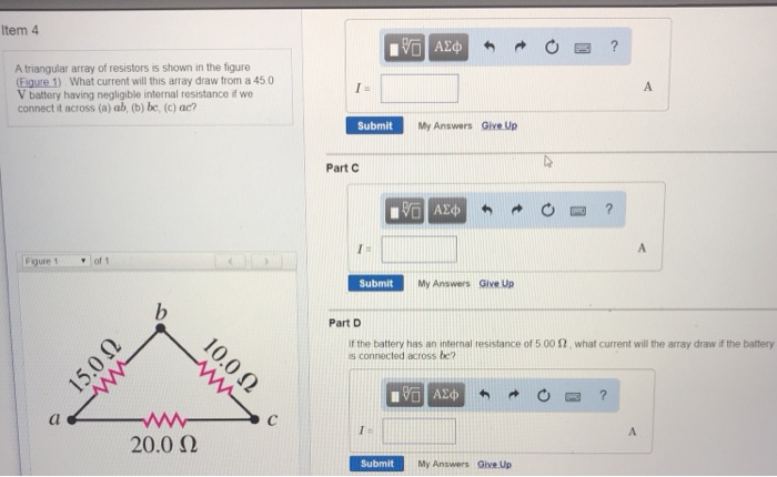 Up to 256 cash back A triangular array of resistors is shown in figure. What current will this array draw from a 350V battery having negligible internal resistance if we connect it across а ab. B bc and с ас.