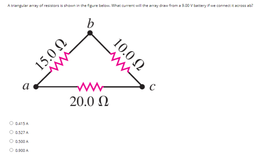 A triangular array of resistors is shown in the figure Figure 1 What current will this array draw from a 450 V battery having negligible internal resistance if connect it across aab b be cac. E266 both meters are idealized the battery has no appreciable internal resistance and the ammeter reads 125 A. 265 1What current will this array draw from a 350 battery having negligible internal resistance if we connect it across a b c.